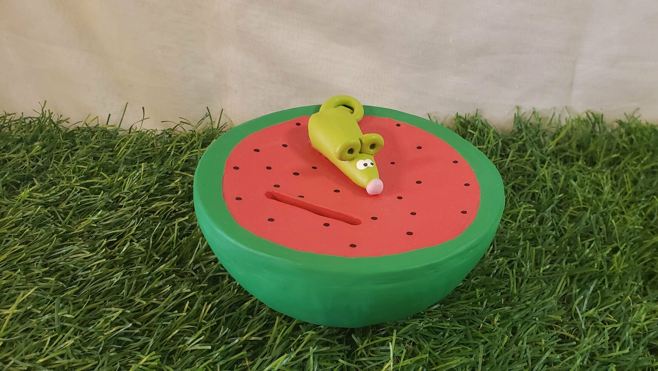 Tirelire personnalisable pastèque rouge et sa souris verte.